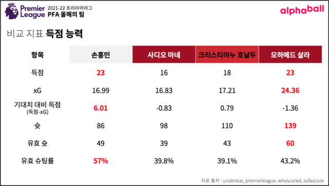 득점 능력을 비교해 보자. 항목은 6개다. 우선 득점은 손흥민과 살라가 23골로 가장 많이 넣었다. 마네와 호날두 모두 이들보다 5~7골이 적다.