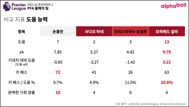 손흥민은 이번 시즌 도움 7개를 기록했는데, 공동 득점왕 살라가 도움 13개를 기록, 도움왕까지 차지하며 묻힌 감이 있다.