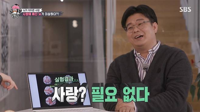 또다른 실험은 같은 여학생에게 이번엔 연인이 아닌 좋아하는 연예인의 사진을 보여줬을 때 뇌 반응이었다. 놀랍게도 연인의 사진을 봤을 때보다 오히려 뇌가 더 새빨갛게 변하며 더 격렬한 반응이 확인했다. 정 교수는 "사랑? 필요없다. 우리는 아름답고 잘생긴 걸 보면 더 풍성한 자극을 얻는다"는 씁쓸한 반전 결론을 제시하며 웃음을 자아냈다.