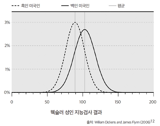 웩슬러지능검사 점수에 따르면 많은 아프리카계 미국인이 평균적인 백인 미국인보다 더 지능이 높다. 이렇게 말할 수도 있다. 많은 백인 미국인이 평균적인 아프리카계 미국인보다 점수가 낮다. 즉 이런 종류의 평균은 개개인의 점수와는 거의 무관하다.