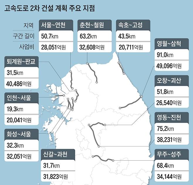 국토교통부는 또 차량 정체가 심한 경인고속도로 인천∼서울 구간(19.3㎞), 수도권 제1순환고속도로 퇴계원∼판교 구간(31.5㎞)에 각각 2조41억원, 4조486억원을 투입해 지하도로를 신설하기로 했다. 국토부 관계자는 “지하도로 건설로 여유가 생기는 기존 지상도로에는 버스전용차로 확대를 적극 검토할 것”이라고 했다. 경부고속도로 청성∼동이 구간(12.3㎞), 중부내륙고속도로 김천∼낙동 구간(24.0㎞) 확장 공사, 금천∼화순 구간(18.6㎞) 고속도로 등도 “교통 혼잡 완화 목적”이라고 국토부는 밝혔다.
