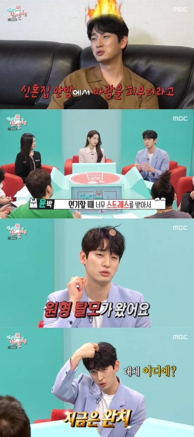 다행히 원형 탈모는 왼치된 상황이었다. 윤박은 "앞부분이 저도 몰랐는데 숍 선생님이 잘 아시잖나. 왔다고 해서 그때부터 두피 주사를 맞으러 다녔다"고 밝혔다. (사진=MBC '전지적 참견 시점' 캡처)