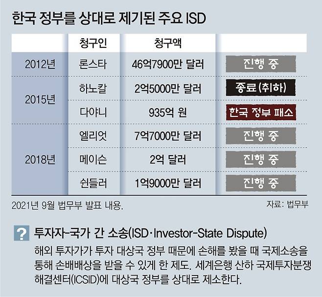 ISD는 해외 투자자가 상대국의 법령이나 정책 때문에 손해를 입었을 경우 국제 중재를 통해 손해배상을 받도록 하는 제도다. 론스타가 한국 정부에 건 ISD 청구액은 46억7900만 달러(약 5조7458억 원)다.