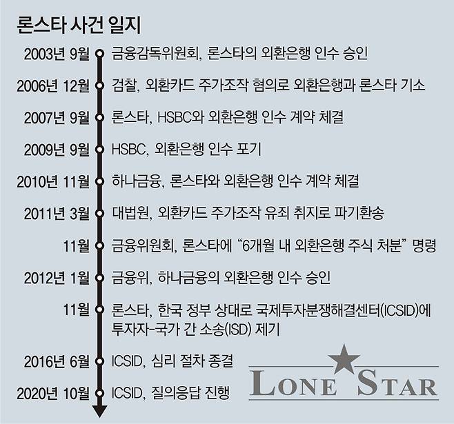 한국 정부와 론스타의 악연은 19년 전으로 거슬러 올라간다. 론스타는 2003년 외환은행 지분 51%를 1조3834억 원에 샀다. “기업가치보다 싸게 팔았다”는 헐값 매각 의혹으로 정부 담당자에 대한 수사가 시작됐지만 대법원은 2010년 무죄 판결을 내렸다. 론스타는 2012년 외환은행을 매각하며 4조7000억 원을 챙겼지만 “한국 정부가 매각 승인을 지연해 손해를 봤다”며 같은 해 11월 46억7900만 달러(약 5조7458억 원) 규모의 ISD를 제기했다.