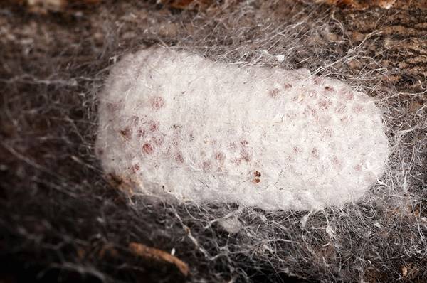 | ▲ 무당거미 알집. 풀줄기나 나무 기둥에 알을 낳고 나뭇잎 등으로 위장한다. |