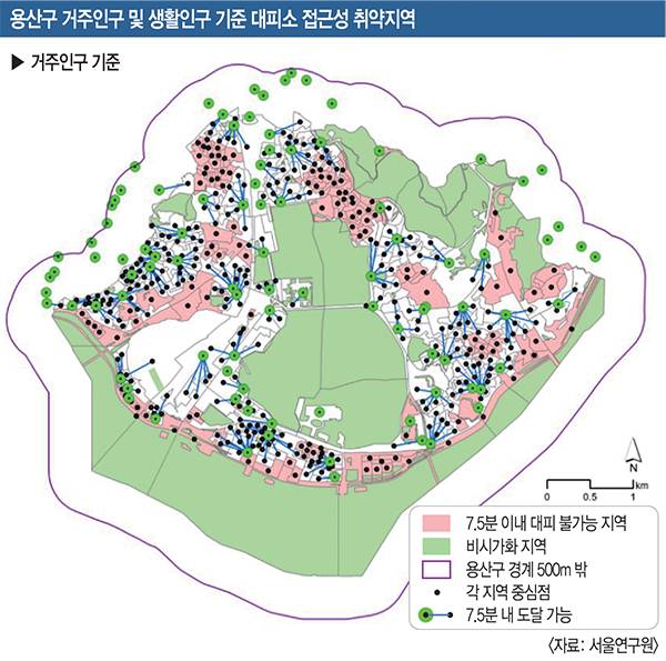 생활인구 32만6592명을 기준으로 하면 민방위 대피소에 접근하기 어려운 사람은 더 늘었다. 7.5분 기준 10만6514명(32.6%), 15분 기준 8028명(2.5%), 22.5분 기준 1323명(0.4%)이 대피소에 도착하지 못한다. 이건 용산 관내는 물론 마포·성동·중구 같은 인접 자치구 경계 500m 안쪽에 있는 대피소까지 포함한 결론이다.