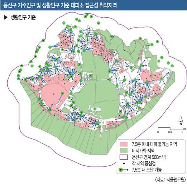 사람이 먹고살 수 있도록 개발된 땅 면적(시가화면적)당 평균 대피소 수가 가장 적은 서울 자치구는 용산(㎢당 4.9곳)이다. 서울연구원 분석 결과 용산 주민 20만4262명 중 29.2%인 5만9555명은 공습 상황에서 7.5분(500m)을 걸어가도 대피소에 도달할 수 없었다. 1.4%인 2849명은 15분(1000m)을 가도 대피소를 찾을 수 없었다. 22.5분(1500m)이 걸려도 대피소로 몸을 숨길 수 없는 주민은 1296명(0.6%)이었다.
