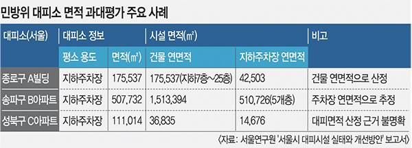 갖춰 놓은 대피소마저 수용 가능 규모를 과대평가했다는 지적을 받는다. 서울연구원이 아파트나 빌딩에 지정된 면적 10만㎡ 이상 대규모 민방위 대피시설을 비교·분석한 결과 실제 수용면적은 지정된 면적을 크게 밑돌았다. 조사된 대피소는 모두 평소 지하주차장으로 활용 중이었다. 그런데 건물 연면적(전체 바닥면적)이나 지하주차장 연면적을 모두 대피소 면적으로 지정한 탓에 편차가 생겼다. 예를 들어 114가구가 사는 서울 강동구 한 아파트는 대피소 면적과 지하주차장 면적이 5459㎡로 같았다. 그런데 129대를 세울 수 있는 주차구획 면적을 제외하고 나니 실제 대피소로 쓸 수 있는 공간은 3839㎡로 줄어들었다. 지정된 대피소 면적의 70%에 불과해 계획된 수용인원 6616명 중 1963명은 대피할 수 없다. 건물 연면적이 3만6835㎡인데 대피소 면적이 근거도 없이 11만1014㎡로 3배 가까이 과대평가된 서울 성북구 공동주택도 있었다.