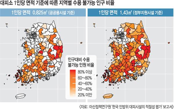 1인당 소요면적을 안보 선진국 수준으로 높이면 상황은 더 악화한다. 스위스(3.30㎡) 기준을 적용하면 인구의 절반가량인 2250만명이 대피할 수 없다. 독일(1.98㎡) 기준으로도 1200만명이 대피소 밖을 떠돌아야 한다.