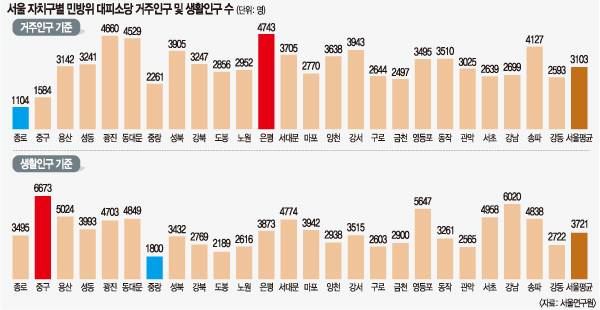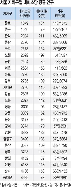 대피소 수는 인구밀도에 비례하지 않는다. 거주인구 기준으로 종로구는 대피소 1곳당 평균 1104명을 수용하면 되지만 인구 대비 시설 수가 가장 적은 은평구는 4743명씩 수용해야 한다. 생활인구 기준으로는 중랑구가 대피소마다 평균 1800명을 들이면 되는 반면 중구는 6673명을 밀어 넣어야 한다.