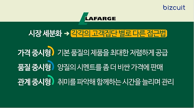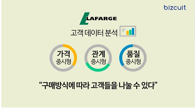 여기 이걸 잘 해 성공을 거둔 기업이 있습니다. 바로 세계 굴지의 시멘트 기업 라파즈(Lafarge)입니다. 2000년대 초반, 점점 회사의 성장이 느려지자 이들은 돌파구를 찾고 나섰습니다. 우선 이들은 고객 데이터를 분석하기 시작했는데요. 그 결과 구매방식에 따라 고객들을 각기 다른 니즈를 가진 집단으로 나눌 수 있다는 것을 발견했습니다. 가격 중시형, 관계 중시형, 품질 중시형으로 말이죠.