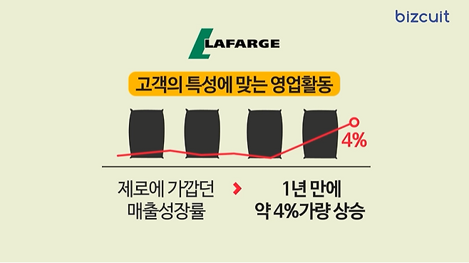 이에 맞춰 영업 방식도 달라졌습니다. 기존에는 생산 원가와 경쟁사 가격을 고려해 모두에게 똑 같은 가격을 제시했는데요. 시장세분화 이후에는 각각의 고객집단 별로 접근법을 다르게 한 거죠. 우선 가격 중시형 고객에게는 기본적인 품질의 제품을 최대한 저렴하게 공급했습니다. 품질 중시형 고객에게는 양질의 시멘트를 좀 더 비싼 가격에 파는 것을 목표로 했고요. 관계 중시형 고객은 골프나 낚시와 같은 취미를 파악해 함께하는 시간을 늘리며 관리하는 데 집중했습니다. 효과는 어땠을까요? 고객의 특성에 맞는 영업활동을 시작한 이후 라파즈는 제로에 가깝던 매출성장률이 1년 만에 약 4%가량 상승했죠. 특히 영국 시장의 경우 마진률이 2.4% 가량 오르는 쾌거를 이루었습니다.