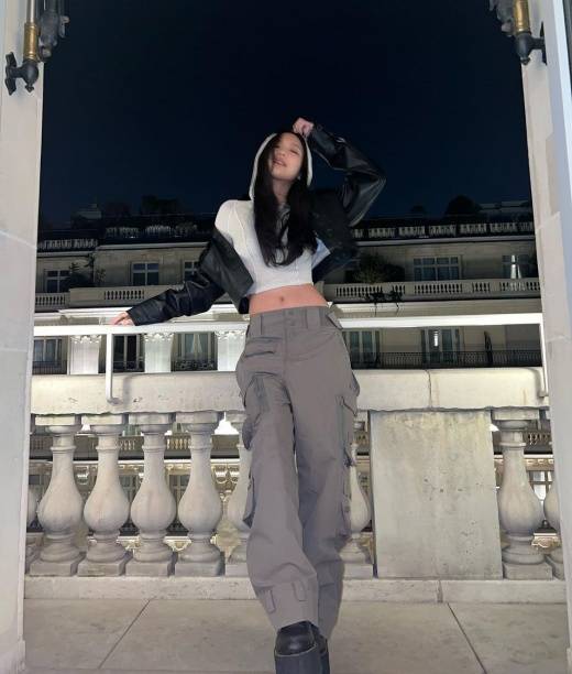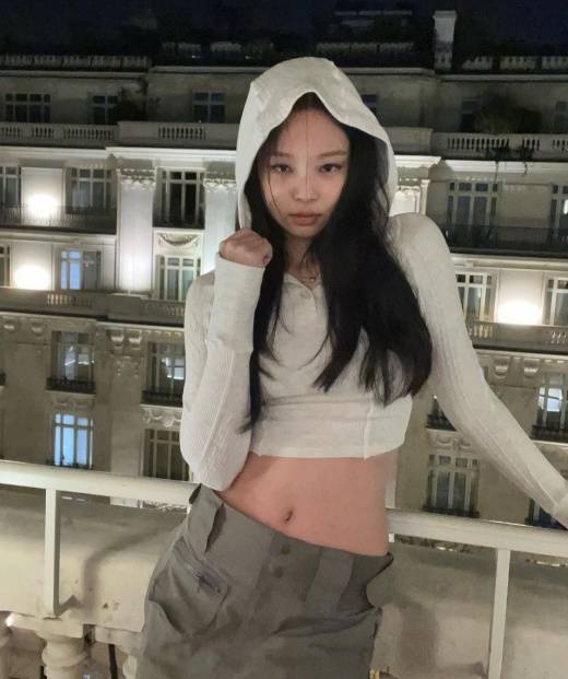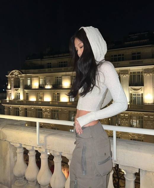 제니는 프랑스에서 파리패션위크 일정을 소화하고 있다. 이국적인 배경이 몽환적인 분위기를 더한다. 제니는 배를 훤히 드러낸 패션으로 한 줌 허리를 자랑했다.