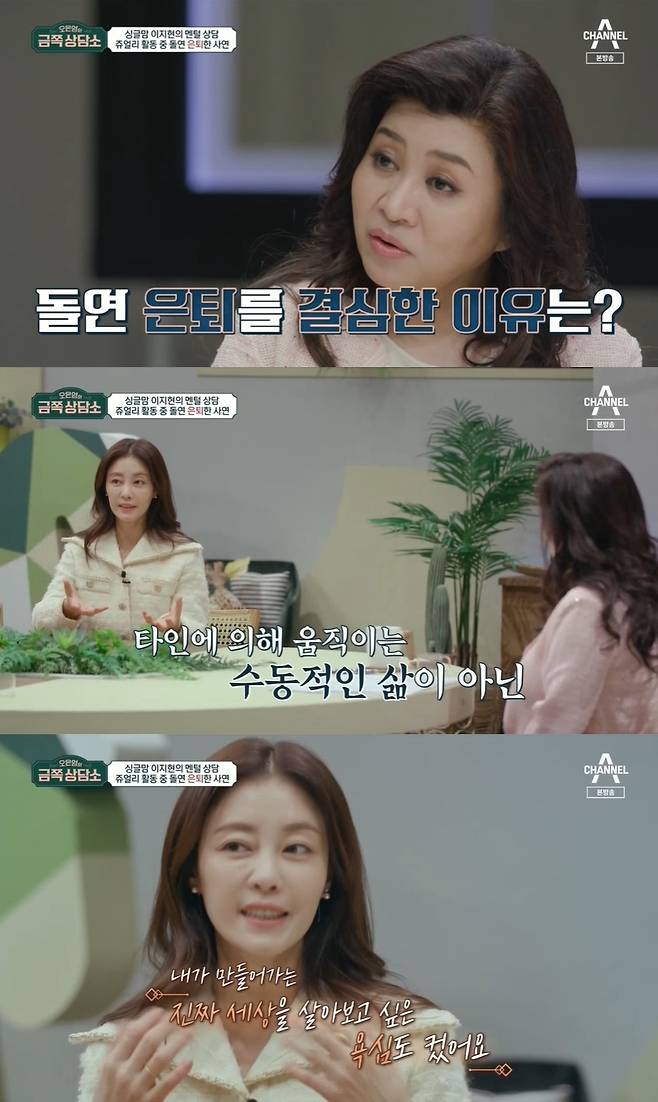 '금쪽상담소' 이지현이 연예계에서 은퇴했던 이유를 털어놨다.