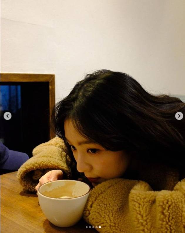 공개된 사진 속 아이린은 밀크티가 담긴 머그잔을 앞에 두고 배시시 웃음을 짓는 모습.