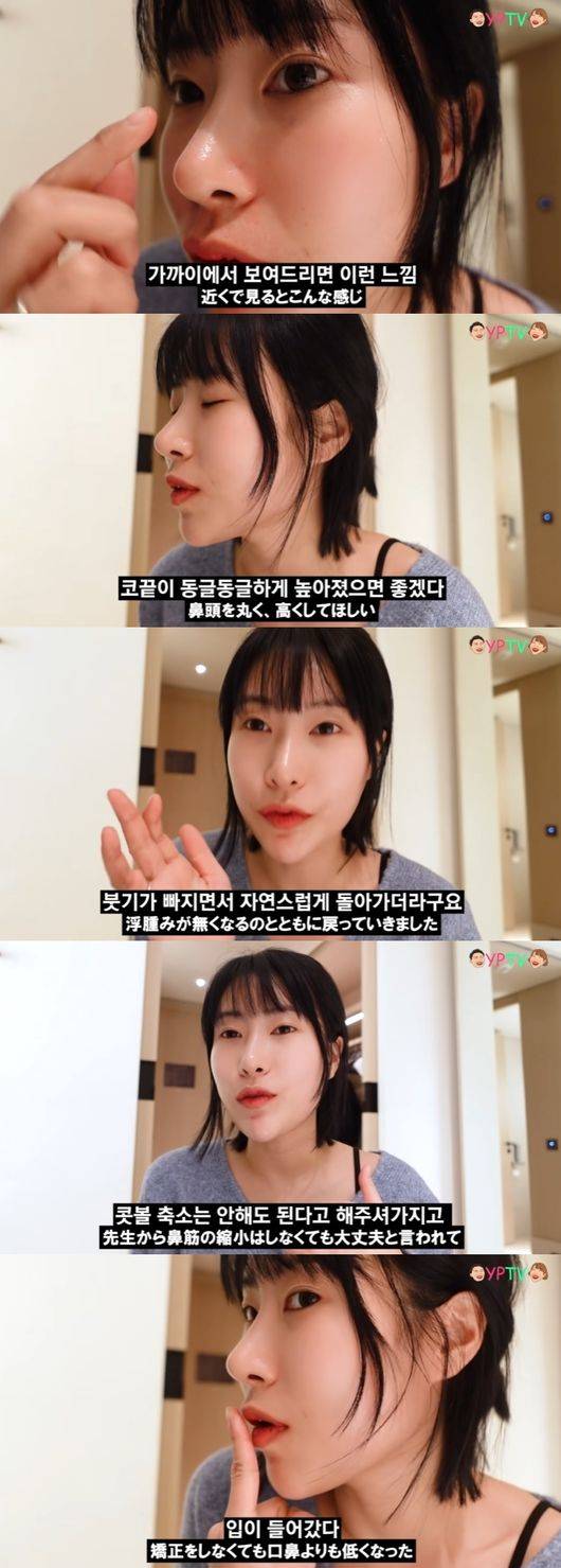 이어 "앞트임 현상은 없냐"고 묻자 "없지는 않은 것 같다. 코가 이렇게 있던걸 살이 모으니 주변살도 모이겠죠. 수술 직후는 눈이 앞트임 너무한것처럼 돼서 걱정됐는데 부기 빠지면서 자연스럽게 돌아가더라. 실제로 눈수술 할때도 앞트임을 했어서 여기서 더 심해지면 걱정이라고 생각했는데 아주 살짝 눈이 커진것같은 느낌이 들더라. 완전 개꿀"이라고 만족했다.