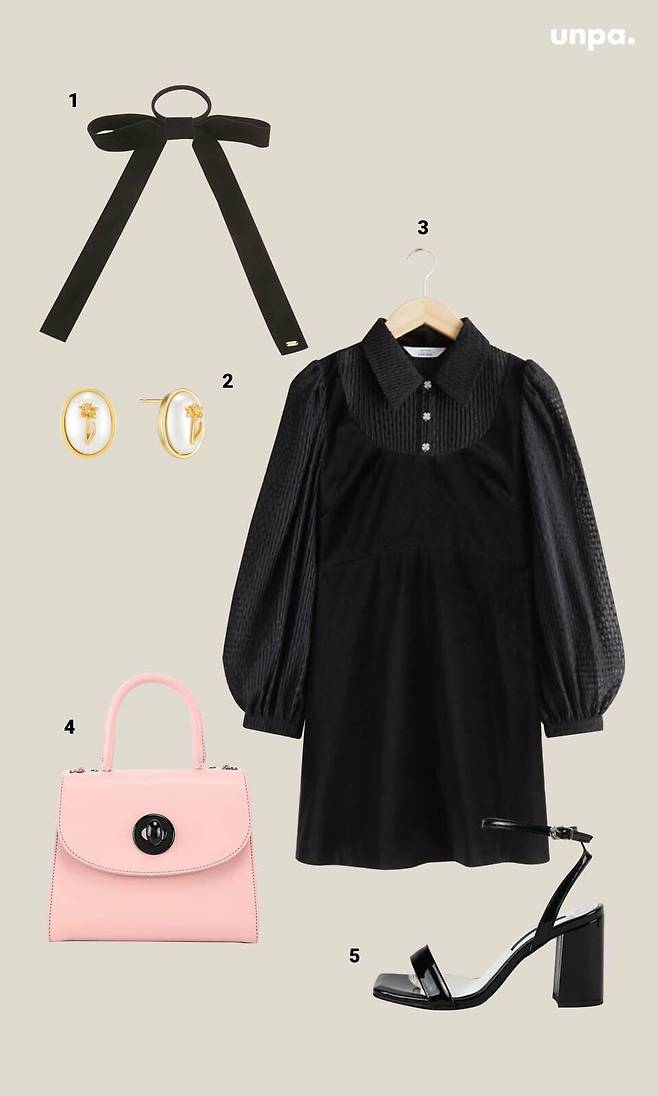 먼저 격식 있는 블랙 컬러의 미니 원피스를 활용한 룩인데,