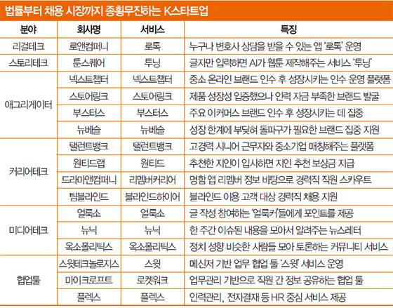 최근 리걸테크, 커리어테크, 스토리테크 등 기존 산업에 테크를 붙인 ‘테크’가 잇따르는 현상은 이런 흐름을 대변한다. 향후에도 다양한 분야에서 혁신적인 K스타트업이 계속 등장할 것으로 예고되는 대목이기도 하다. 그동안 낙후됐던 전통 산업의 디지털 전환을 주도하고 있는 테크는 어떤 곳이 있을까.