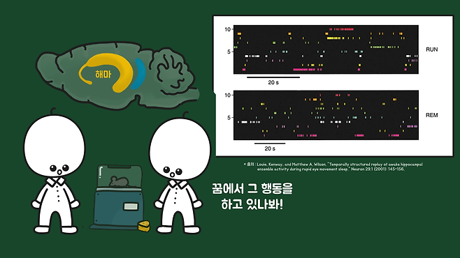 2001년 메튜 윌슨 연구팀은 쥐에게 특정 행동을 훈련시킨 뒤 수면 중 뇌 신호를 관찰했습니다. 그리고 렘수면 단계에서 뇌 영역 중 기억을 담당하는 해마라는 곳에서 그 행동에 해당하는 신경 신호가 되풀이하듯이 재생된다는 것을 확인했습니다.