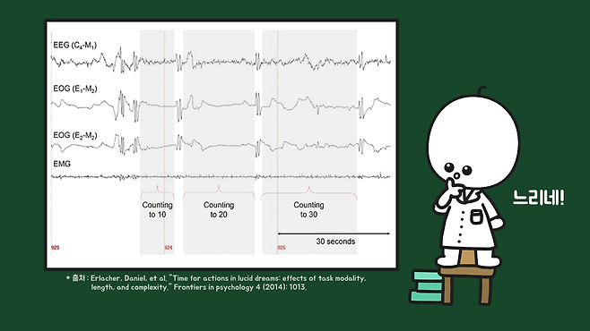 과학자들은 루시드 드리머를 통해 꿈에서의 시간 흐름을 측정하고자 했습니다. 꿈은 렘수면 단계에서 꾸고, 렘수면 때 이완되지 않는 안구 근육 신호를 활용하도록 하면 현실과 꿈에서의 시간 흐름의 차이를 알 수 있을 겁니다.