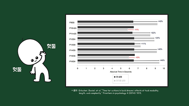 그런데 이 신호는 깨어 있을 때 행동하던 것보다 평균 40% 정도 느리게 재생됐습니다. 이를 바탕으로 꿈에서의 시간이 느리게 흐른다는 것을 간접적으로 파악할 수 있었습니다.