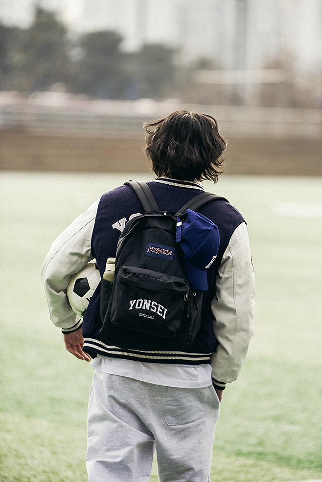 요즘 유행하는 바시티 재킷과 정말 좋은 궁합을 보여주는 백팩.