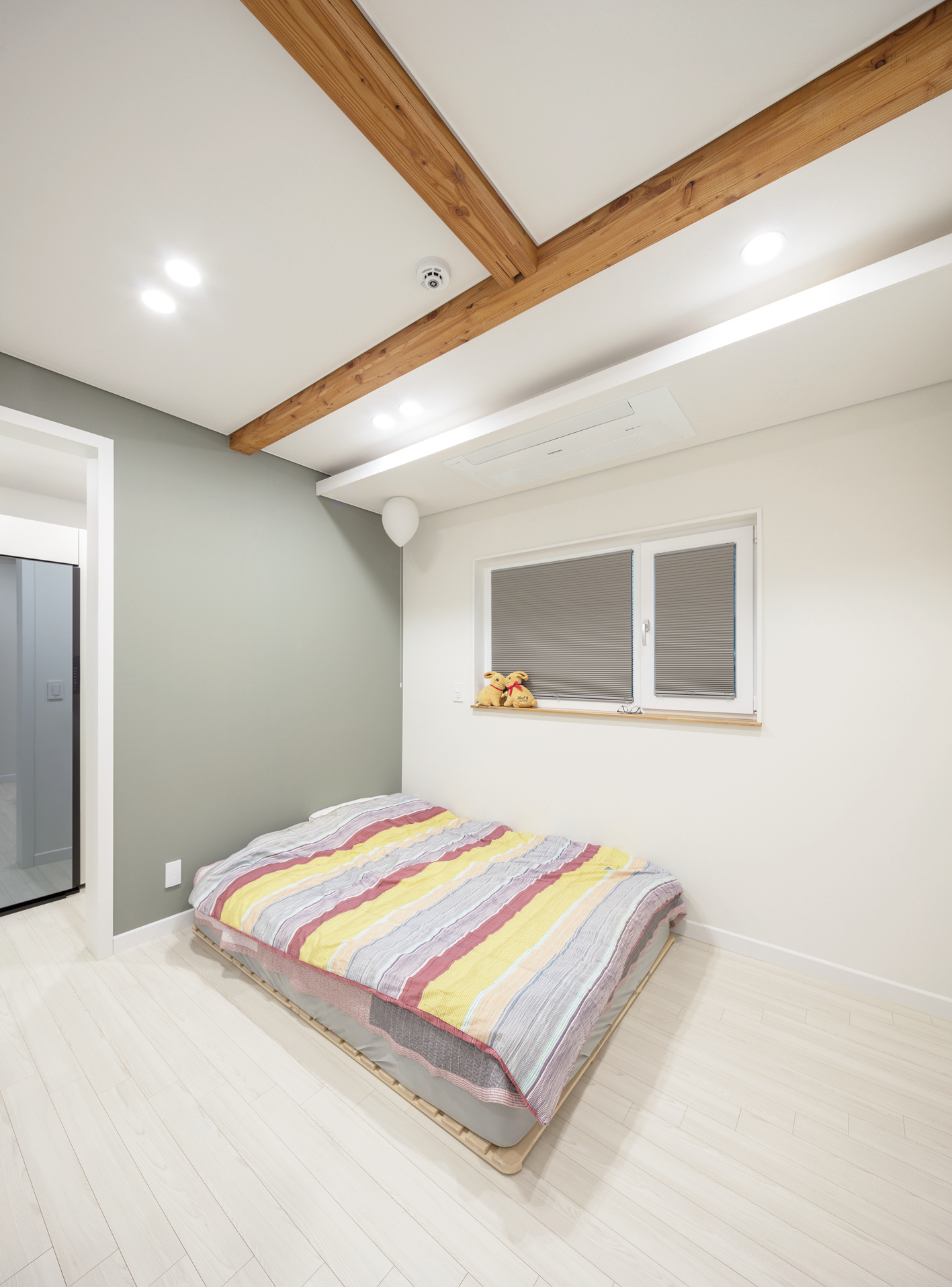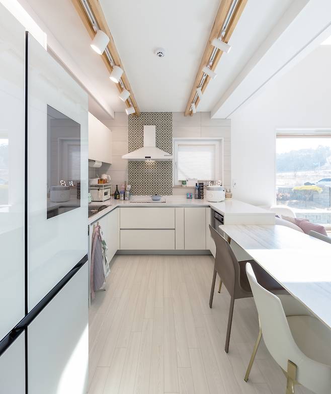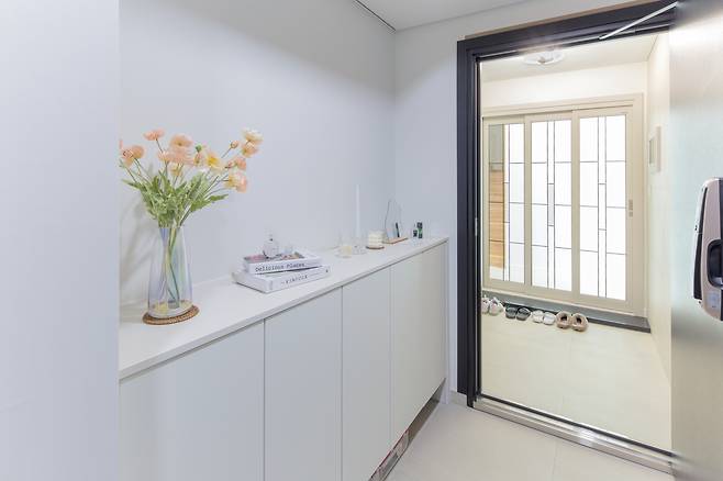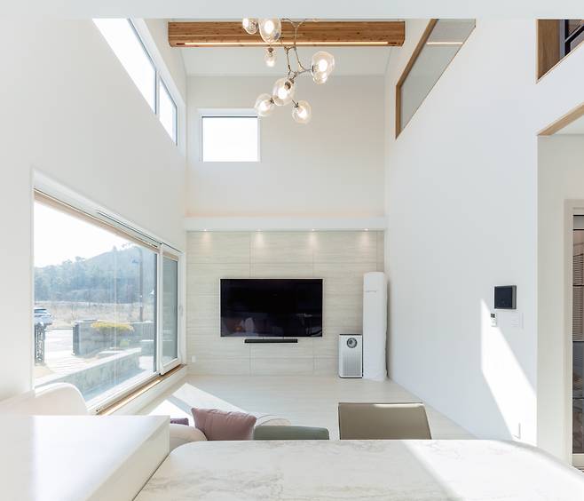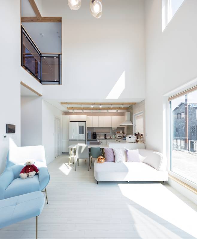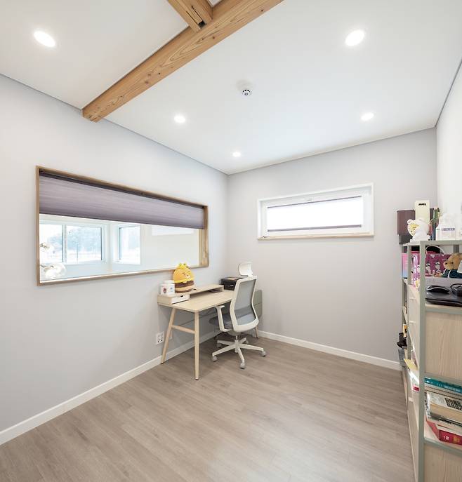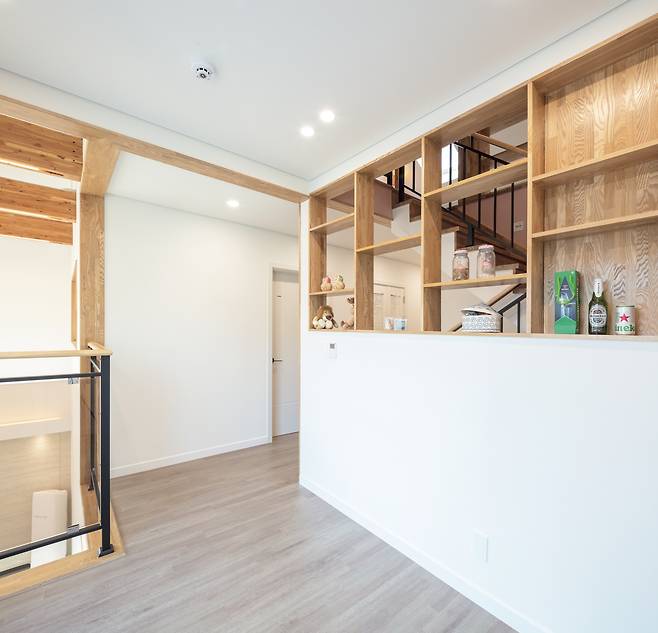 전체 인테리어는 벽과 바닥, 천장을 화이트 톤으로 마감하고, 중목구조를 적절하게 노출시켜 자연스럽게 조성했다. 복도 안쪽으로 들어서면 초소형 공용화장실과 드레스룸·화장실을 포함한 안방이 배치됐다.