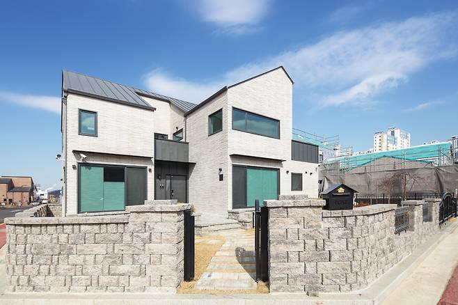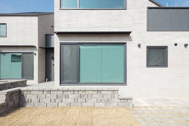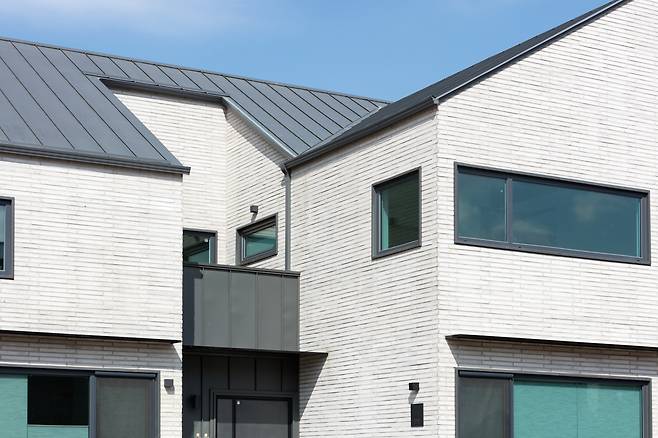 단독주택 필지들을 블록으로 계획한 경기도 화성시에 자리한 중목구조 듀플렉스하우스. 여느 듀플렉스하우스에 비해 입면 디자인이 도드라져 보인다. 월메이드 건설 정희국 실장은 “외장재인 롱블릭 타일과 그 사이사이에 채워 넣은 비둘기색 줄눈, 지붕재인 징크 스타일 컬러강판, 징크로 포인트를 준 현관과 발코니, 철판을 얇게 가공해 만든 포치와 거실 창 상부 눈썹처마, 시스템창호 창틀에 적용한 블랙 매핑Mapping 등 모던한 외관에서 고급스러움이 묻어나도록 개별 요소들이 한데 어우러지게 디자인했어요”라며 입면 디자인 개념을 설명한다.