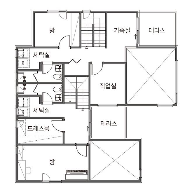 2층에는 가족실과 작업실, 작은방, 화장실, 세탁실이 있다. 가족실과 작업실은 개구부와 창을 통해 1층 거실과 소통하는 구조다.