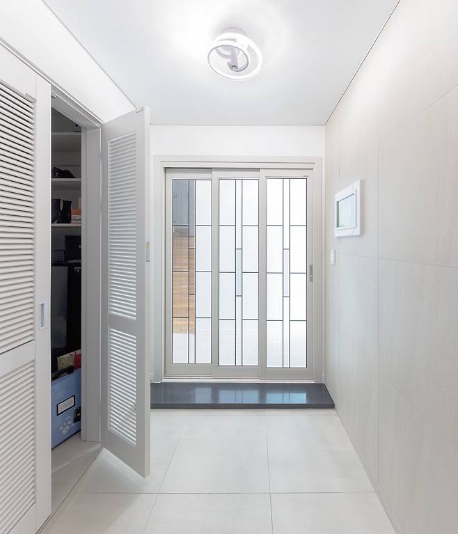 정 실장의 안내를 받으며 듀플렉스하우스와 중목구조의 고정관념을 깬 세대별 맞춤형 주택 속으로 들어가 보자. 평면상 좌·우측으로 세대를 구분한 주택에는 세대별 전용 현관 외에 보기 드문 공동 현관이 있다. 각 세대로 드나드는 중앙 공동 현관, 그 좌우에 방향을 틀어 세대별 전용 현관을 배치한 형태이다. 여유로운 중앙 현관에서부터 ‘이게 바로 중목구조야!’라고 강조하는 듯하다.