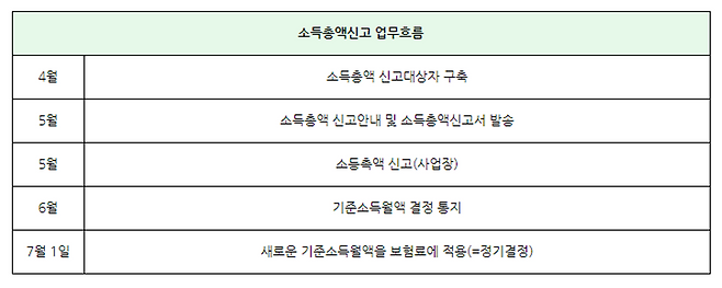 소득총액신고로 결정된 기준소득월액은 국민연금 보험료(=기준소득월액*9%)를 결정하는 기준이 됩니다. 또한, 이때 신고하는 소득총액은 전년도 1개월 이상 근로한 사업장가입자의 전년도 1월 1일부터 12월 31일까지 기간 중 해당 사업장에서 받은 소득의 합입니다. ( 연도 중간에 입사한 경우에는 현 사업장에서 근무기간 동안 받은 소득총액)