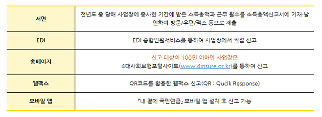 소득총액신고는 국세청에 근로소득 지급명세서를 제출하였으면 생략할 수 있는데요. 그 외의 경우 5월 말까지 공단에서 송부한 소득총액신고서를 작성하여 웹팩스, 모바일 앱, 홈페이지, 방문 등의 다양한 방법으로 소득총액을 신고해주시면 됩니다. 자세한 신고 방법은 아래 표를 참고해주세요:)