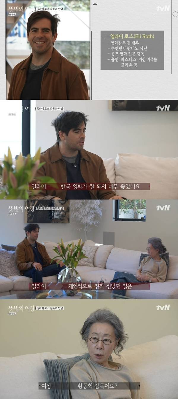 22일 방송된 tvN '뜻밖의 여정'에서 윤여정은 자신을 찾아온 일라이 로스 감독과 대화를 나눴다. 일라이 로스 감독은 호러 영화 마니아들 사이에서 자주 언급되는 작품인 '호스텔'의 감독이다.