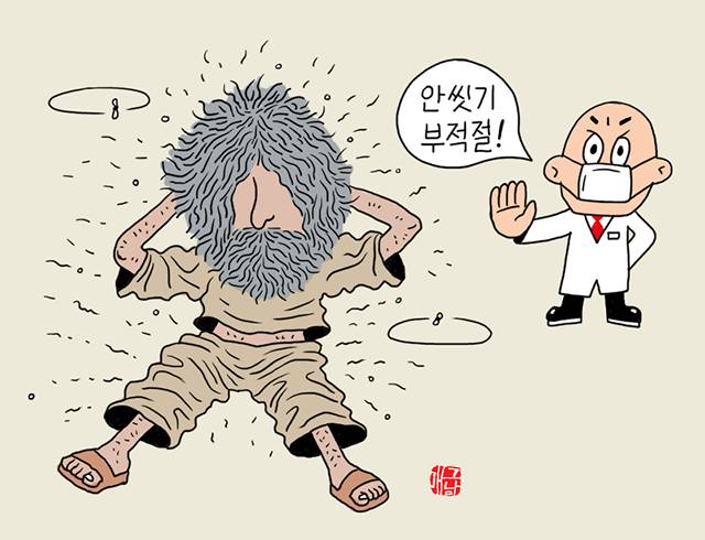 아무우하지 정도는 아니지만 우리 주변에도 씻는 행위에 대해 크고 작은 반감을 가진 사람들을 종종 볼 수 있다. 얼굴과 몸을 씻거나 양치질을 하는 것이 피부·치아 건강에 해롭다고 생각해 씻는 횟수를 줄인다거나, 씻을 때마다 일부 절차를 생략하는 식이다. 범위를 넓히면 특별한 피부질환이 없음에도 샴푸, 비누, 클렌징 제품 등을 극단적으로 사용하지 않는 사람들 또한 포함될 수 있다. 이 같은 행동은 우리 몸에 어떤 영향을 미칠까. 고려대 안산병원 피부과 유화정 교수는 “피지와 먼지를 제거하지 않고 모공이 막혔을 때 제대로 처리하지 않으면 피부염, 모낭염이 발생할 수 있다”며 “부상으로 인해 특정 부위를 오래 씻지 못하는 사람이나 노숙자들의 경우 각질이 튀어나오고 각질과 먼지랑 뒤엉켜 피부에 문제가 생기곤 한다”고 말했다. 이어 “이 남성(아무우하지)의 경우 혼자 생활하다보니 주변에 영향을 주지 않았지만, 집단생활을 할 경우 전염성 질환을 유발할 위험 또한 있다”고 덧붙였다.