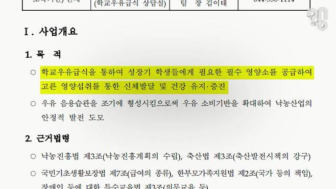 그렇다면 우유급식의 목적은 뭘까? 가장 최근인 2021년도 학교우유급식사업 시행지침에 따르면 우유급식 목적은 ‘성장기 학생들에게 필요한 필수 영양소를 공급해 고른 영양섭취를 통한 신체발달 및 건강 유지, 증진’과 ‘우유 음용습관을 조기에 형성시킴으로써 우유 소비기반을 확대하여 낙농산업의 안정적 발전 도모’하기 위함이라고 나와있다.