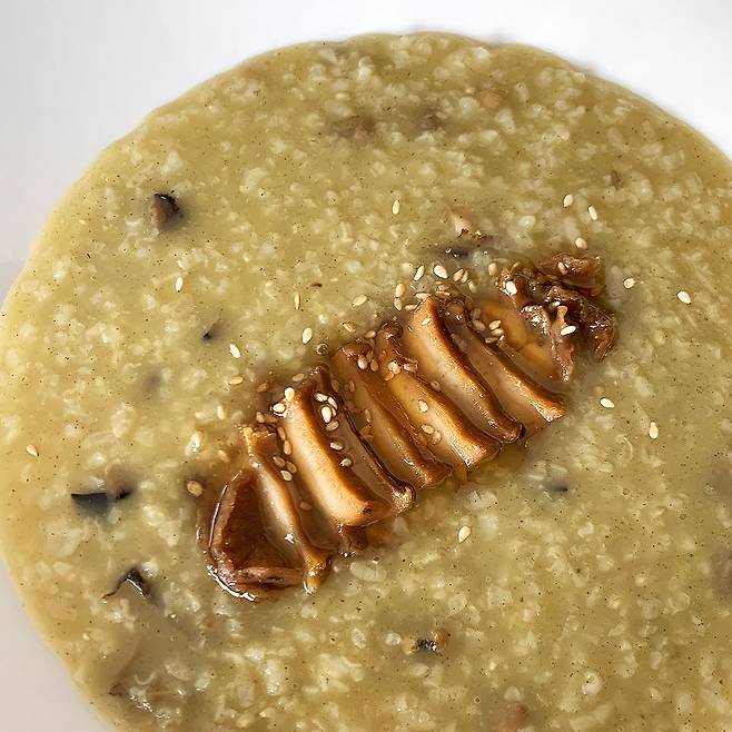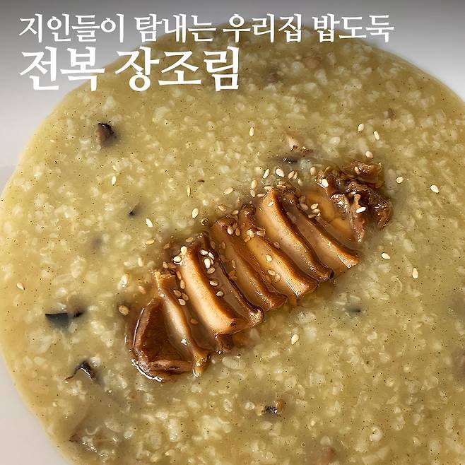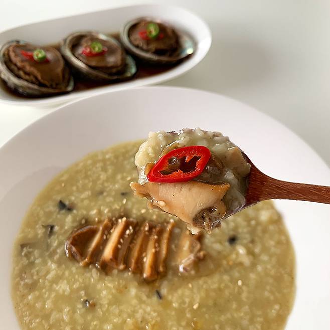걸쭉~하게 잘 끓여 낸 전복 내장죽을 그릇에 담고, 장조림 전복 한 개를 슥슥 썰어서 올려주면 한 그릇에 최소 15,000원은 받아야 할 것 같은 비주얼로 완성된답니다 ✧₊