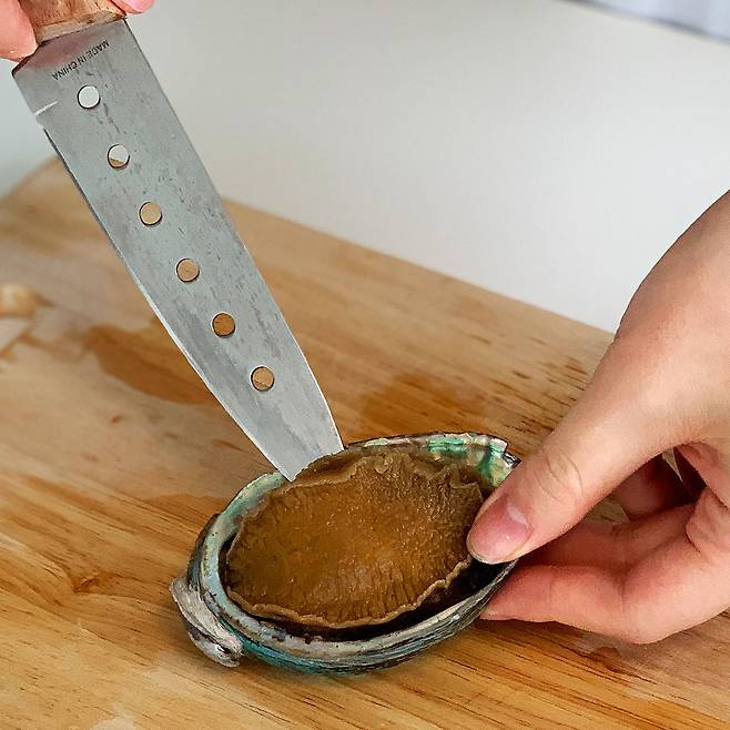 이렇게만 먹기는 아쉬운 맛에 바로 칼을 들고 내장을 분리해서 전복죽도 도전! 전복 손질하실 때는 이빨도 꼭 같이 분리해 주셔야 해요.