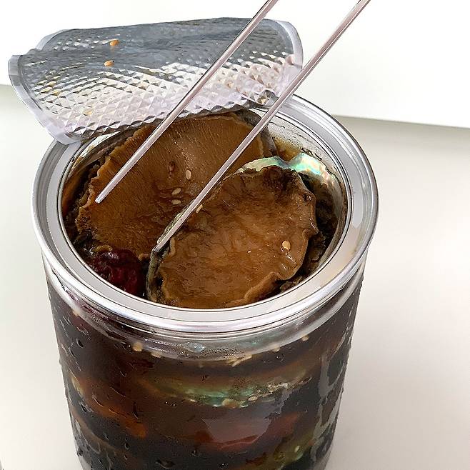 간장 새우와 전복 장조림 두 가지가 있었는데 저는 전복장으로 2통 주문했답니다! 냉동상태로 배송되는 제품이라 받자마자 해동해서 오픈해 보니, 전복이 한가득! 살아있는 전복을 그대로 담근 것 같은 비주얼이었어요. ✧₊