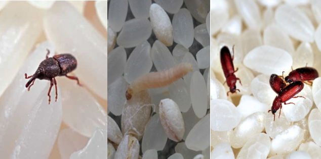 쌀벌레는 크게 3종류로 코끼리 코와 비슷한 입을 가지고 있는 쌀바구미, 포장지를 뚫고 침투하며, 나방과 비슷한 생김새를 하고있는 화랑곡나방, 길쭉한 타원형의 적갈색의 거짓쌀도둑거저리가 있습니다.