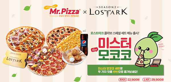 미스터피자는 전 세계적인 인기를 얻고 있는 스마일게이트RPG의 MMORPG ‘로스트아크’와 손을 잡은 콜라보 피자 세트를 선보였다. ‘미스터모코코 피자 세트’라는 이름의 세트로, 하프앤하프 피자와 치즈볼, 음료가 한 박스에 담긴 구성이다. 치즈볼은 이번 세트를 통해 선보이는 신제품으로, 오븐에 구워 기름기를 뺀 쫄깃한 맛을 가진 메뉴다. 로스트아크 대표 캐릭터인 모코코로 꾸며진 피자박스에는 게임 아이템 쿠폰이 동봉돼 있다.