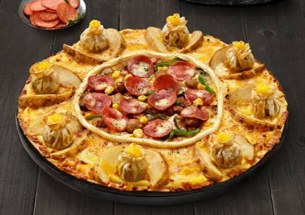 도미노피자는 비비고와 컬래버레이션을 통해 신제품을 선보였다. 복을 가득 담은 비비고의 복주머니 만두를 피자에 얹은 ‘새해 복 만두 피자’가 바로 그것이다. 비비고 만두의 노하우를 담은 전용 피를 사용한 복주머니 만두, 프로마쥬 블랑 크림 치즈 무스, 모차렐라 치즈, 페퍼로니 등 다양한 토핑이 피자에 얹어져 있다. 만두 안에는 돼지고기가 큼직하게 들어있어, 입 안 가득 풍부한 육즙을 맛볼 수 있다.