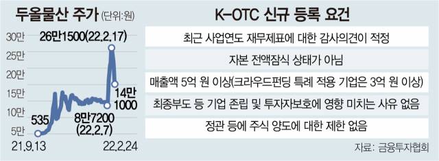 금융투자협회가 코스피·코스닥 시장에서 상장폐지 사유가 발생한 기업의 장외주식시장(K-OTC) 등록을 금지하는 방안을 내놓는다. 최근 K-OTC 시가총액 1위 기업인 두올물산의 이례적인 주가 폭등을 계기로 시장 안정성을 높이기 위한 대응책 마련에 나선 것이다.★본지 2월 15일자 2면 참조
