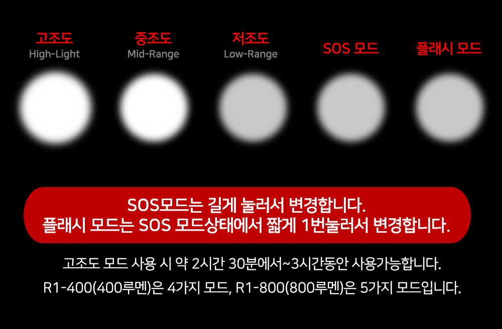 상품명 R1-400 사정거리 200m 무게 124g 밝기 400루멘 거치방식 실리콘 밴드 거치 모드 4가지모드 고조도 저조도 SOS 플래시 모드입니다.