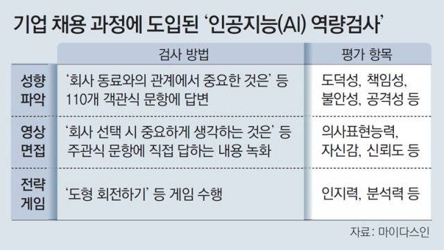 AI 역량검사가 확산되면서 취업준비생들의 부담이 커질 것이라는 우려도 나온다. 대학생 정모 씨(24)는 “AI 면접과 관련된 정보가 부족하다”며 “불안한 마음에 사설학원에 다니는 친구들도 있다”고 말했다.