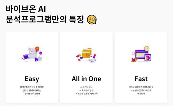 김창선 바이브온 대표는 “이 프로그램을 활용하면 한 시간 넘게 생기부를 읽으며 일일이 찾아서 비교해봐야 했던 정보들을 5분 안에 일목요연한 세부 리포트로 받아볼 수 있다”며 “수험생과 부모님들뿐 아니라 학교 현장에서도 유용하게 사용될 것으로 기대하고 있다”고 말했다.