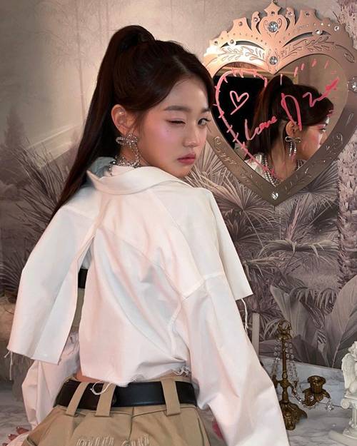 그런가하면 같은 팀 멤버 안유진은 상대적으로 낮은 위치의 포니테일을 통해 부드럽고 단정한 무드를 선보였다. 오히려 풀은 머리를 드러냈을 때보다 훨씬 성숙한 모습. 안유진 특유의 시크함과 우아함을 동시에 표현해냈다.