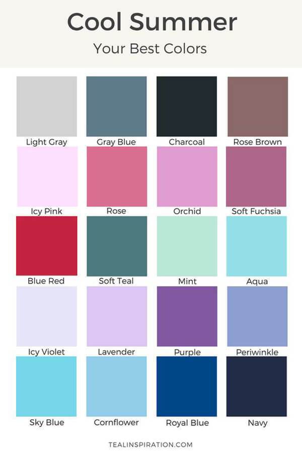 여름 쿨톤이 가장 잘 어울리는 컬러는 고명도 고채도의 화이트가 섞인 파스텔컬러다. 여름 쿨 라이트 톤의 경우, 맑은 느낌을 주면서 채도가 낮고 밝은 파스텔 톤과 잘 어울린다. 여름 쿨 소프트는 라이트보단 채도가 있으면서 회색이 섞여 차분한 느낌을 주며 회색기 섞인 색이 잘 받는다. 정석 여름 톤인 여름 쿨 트루 톤은 너무 연하거나 진하지 않으면 모든 쿨톤 색을 소화할 수 있다.