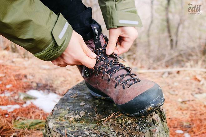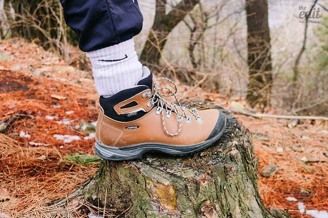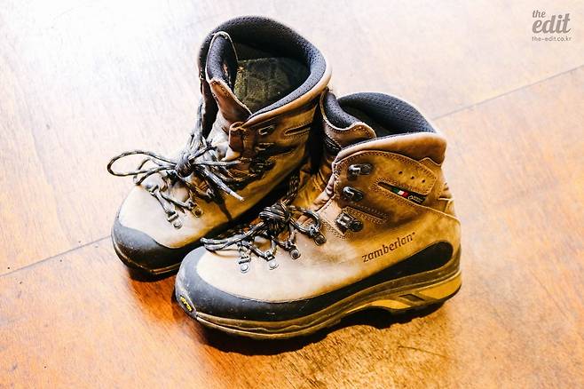 “헬리녹스에서 수입해 오는 이탈리아 브랜드 아솔로의 등산화다. 행사에서 샀다. 내 돈 내고 처음 사 본 등산화다. 통가죽으로 된 디자인과 고무가 한 번 더 덧대어진 앞 코가 마음에 들어 골랐는데, 신다 보니 발에도 잘 맞는 것 같다.”