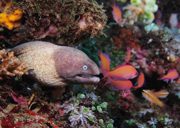 성질이 포악한 곰치(뱀장어목 곰칫과)는 드라마틱한 관찰 대상 중 하나다. 한치 앞도 보이지 않는 밤바다 속 산호초나 바위틈을 수중랜턴으로 비추면 날카로운 이빨을 드러내는 곰치를 만나곤 한다. 대개 몸길이가 60~100㎝인데 인도양과 태평양 열대 해역에서 발견되는 대왕곰치(Giant moray)는 최대 3m에 이른다.