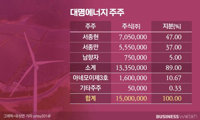 대명에너지는 2000년 8월 ‘솔반’으로 설립된 이래 2007년 5월 서 대표의 부친 고(故) 서기섭 대명지이씨 회장이 개인자격으로 지분 100%를 직접 인수한 업체다. 원래는 서 회장 1인 회사였던 셈이다.